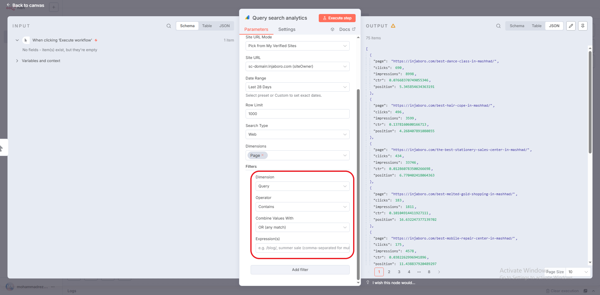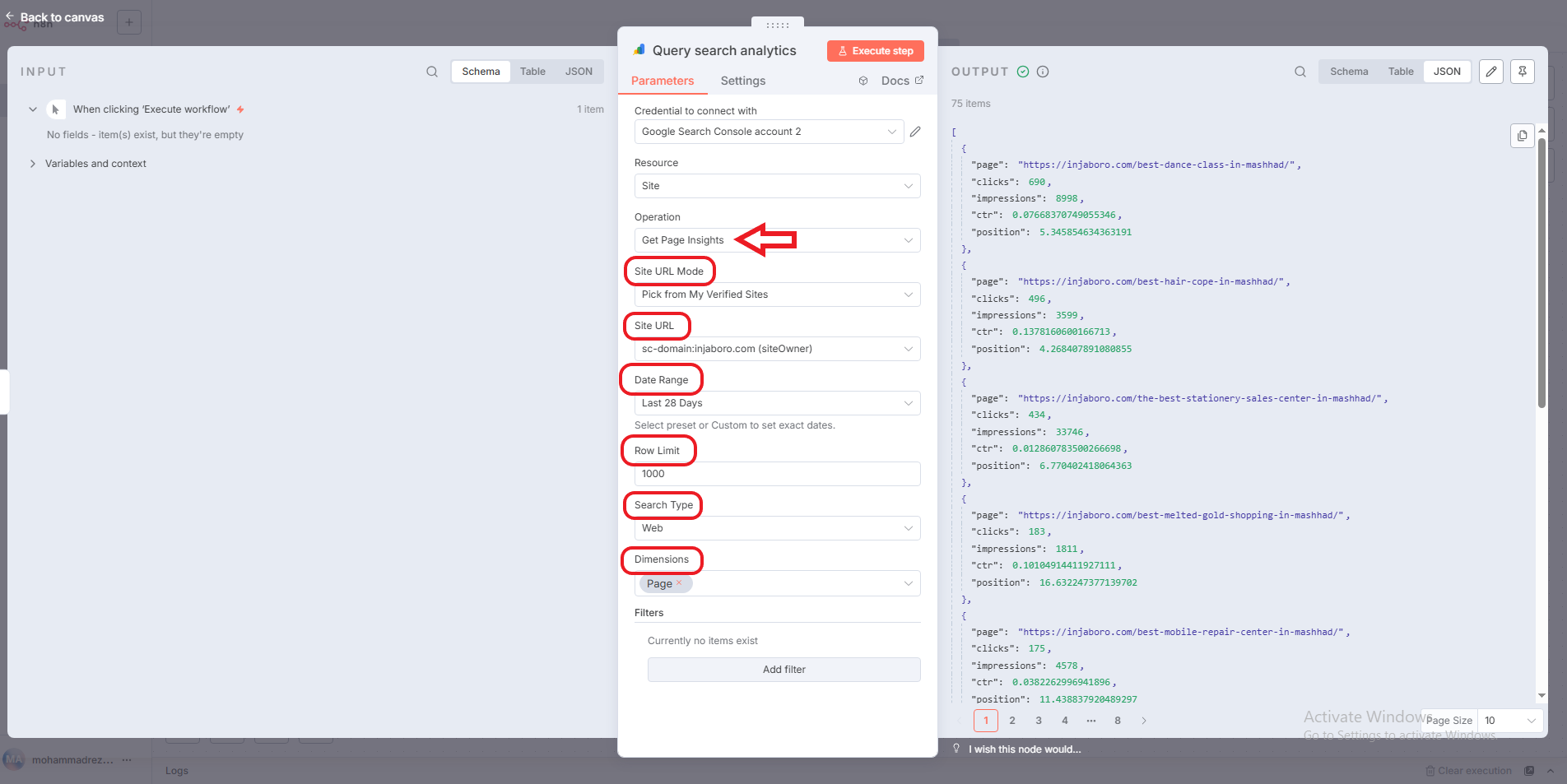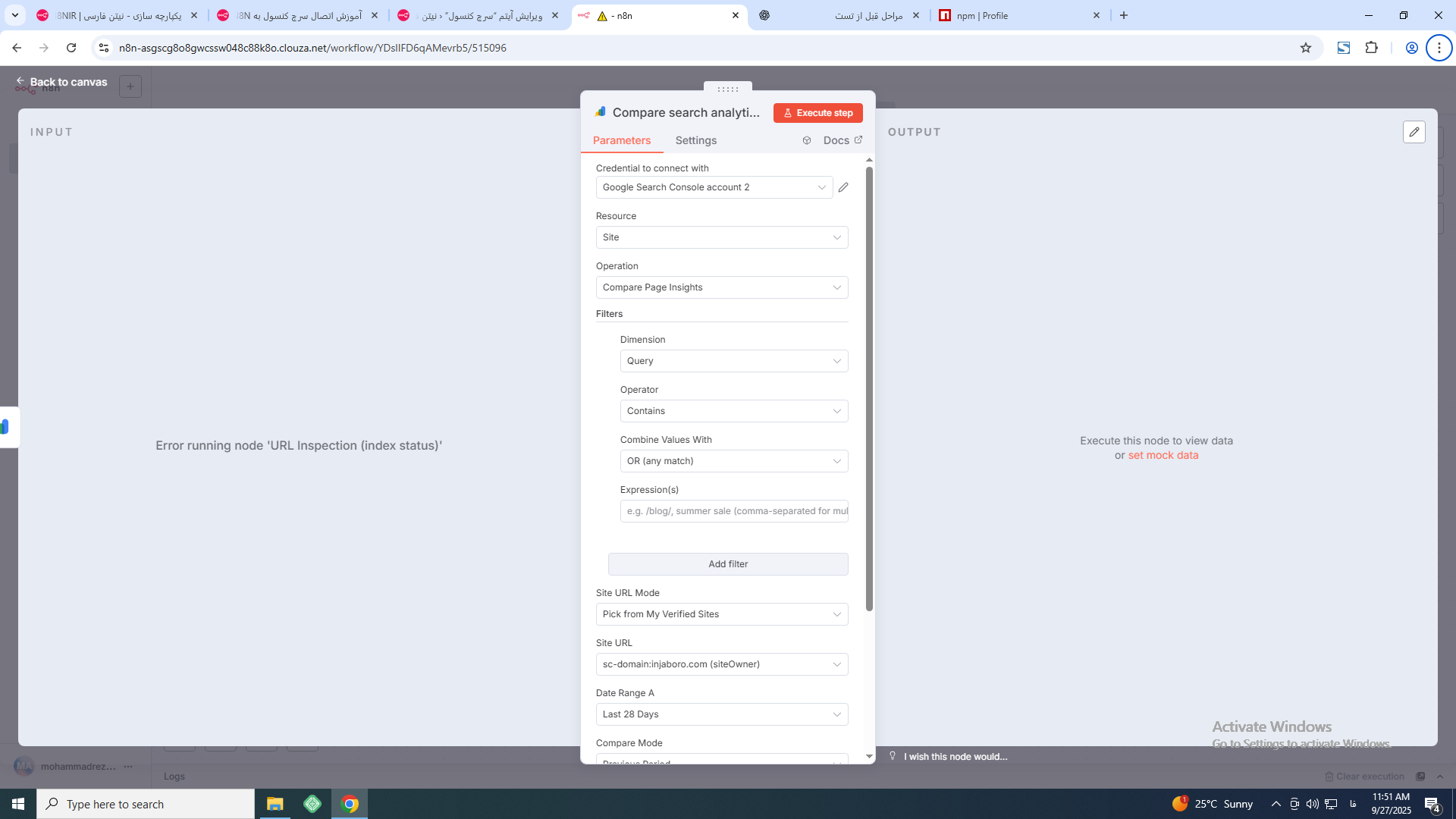 1. داخل نود Google Search Console در n8n مشخص میکند که وقتی دارید آمار یا Page Insights را مقایسه می‌کنید: