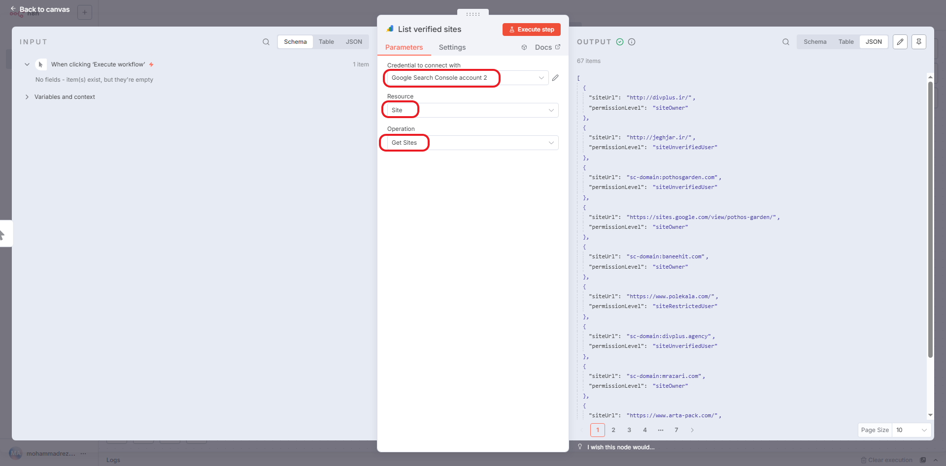 • n8n :Operation → Get Sites، لیست تمام سایت های متصل و تایید شده در حساب Google Search Console را برمیگرداند تا بتوانید روی آن ها داده ها را تحلیل کنید.