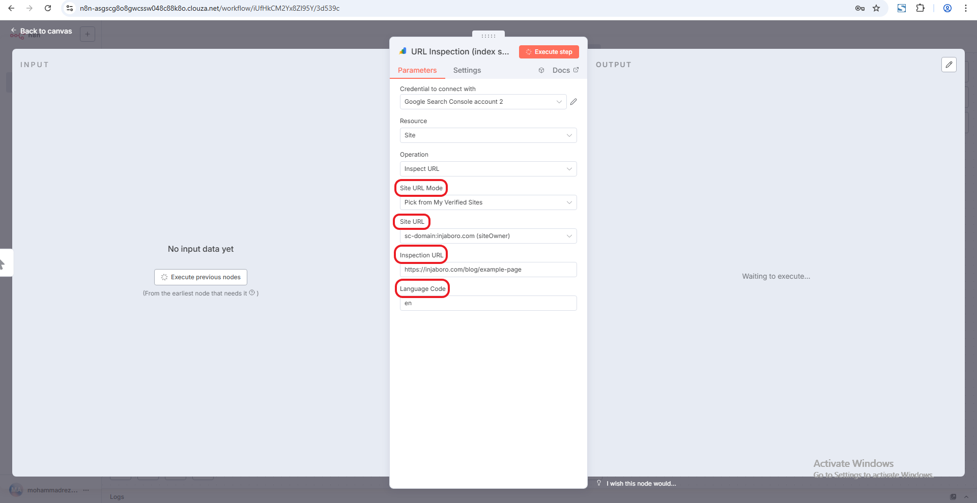 • Credential to connect with → Google Search Console account 2 : مثل (کلید ورود امن n8n به حساب Google Search Console) عمل می‌کند و تمام داده‌های سایت و صفحات را بدون نیاز به رمز عبور در اختیار n8n قرار میدهد.