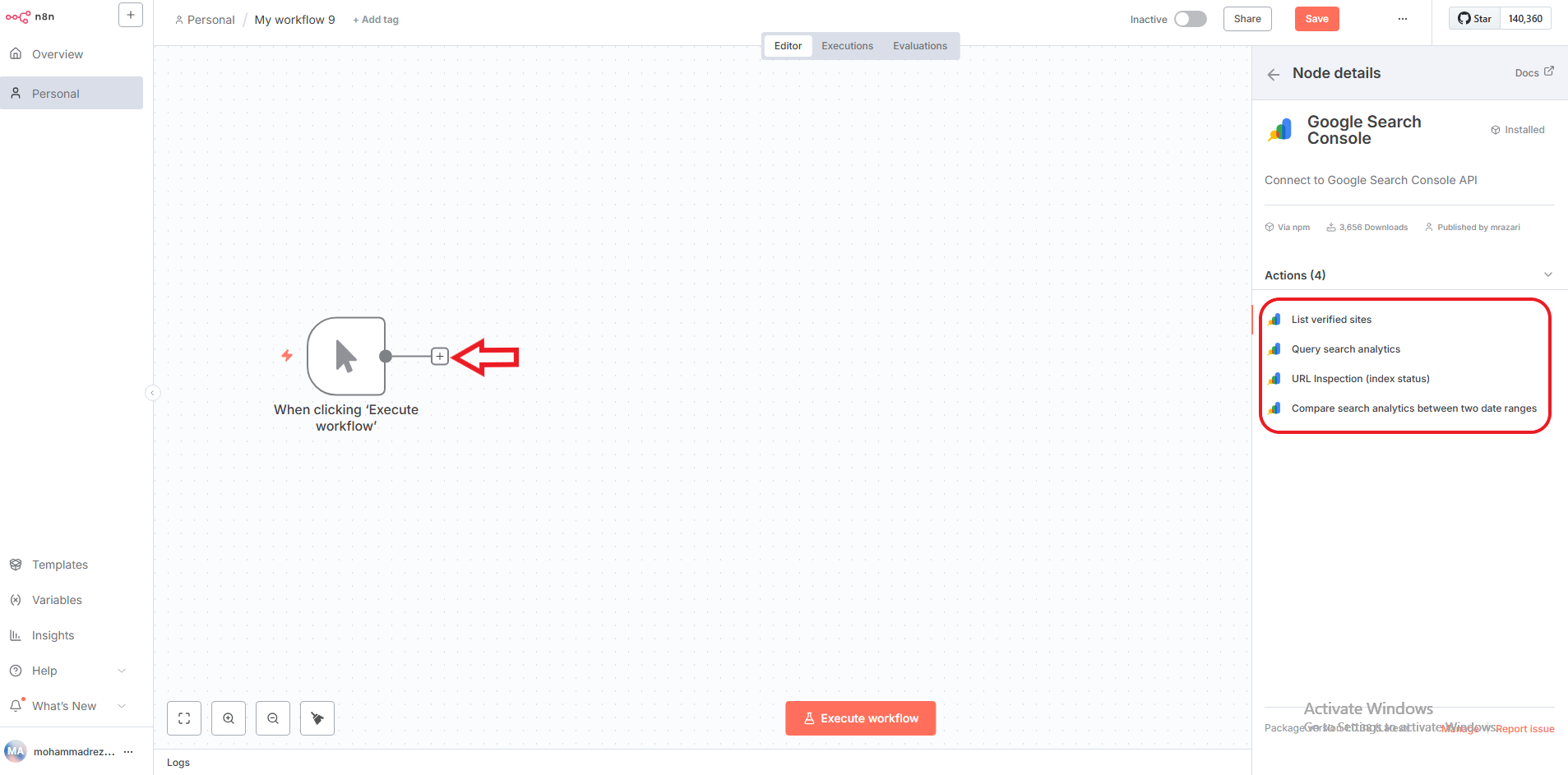 • در بخش Community Nodes یا Custom Nodes، آدرس “n8n-nodes-google-search-console” را وارد و عملیات نصب را انجام دهید.