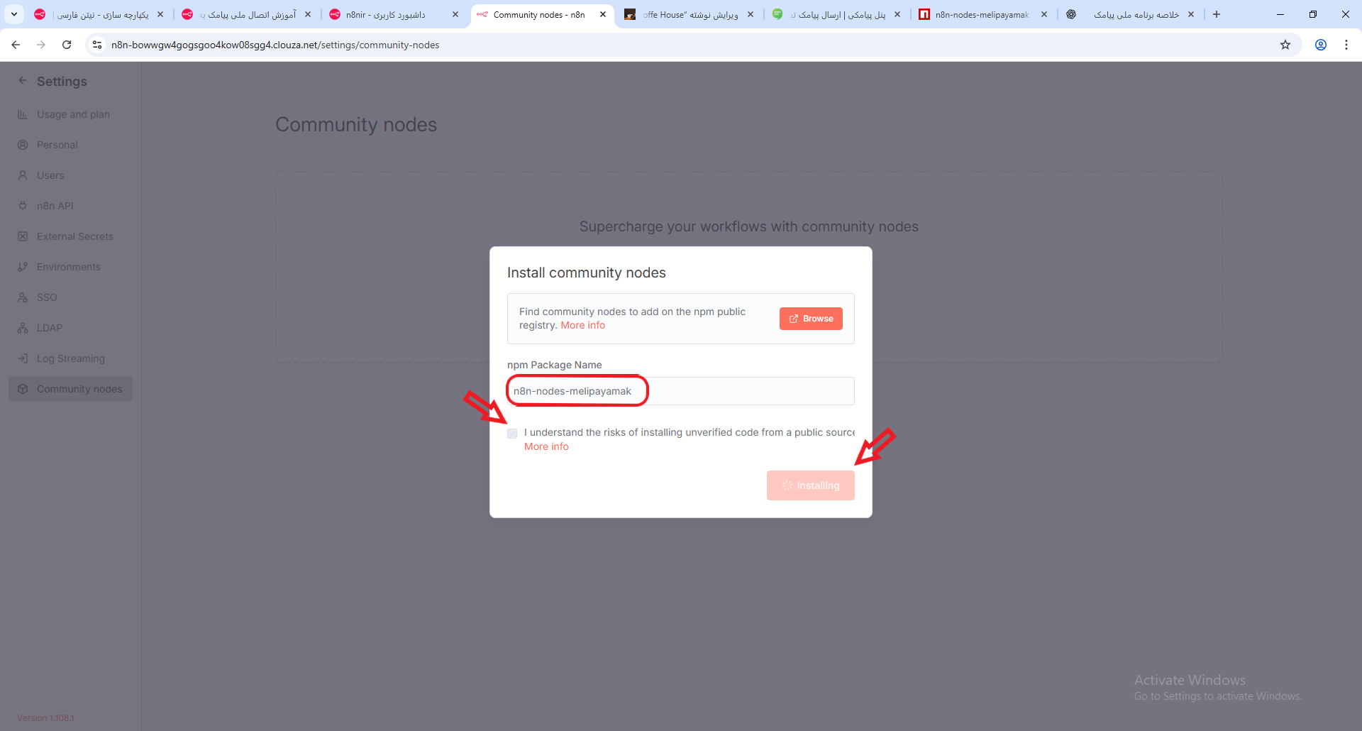 - وارد بخش Community Nodes شوید و روی دکمه Install کلیک کنید.