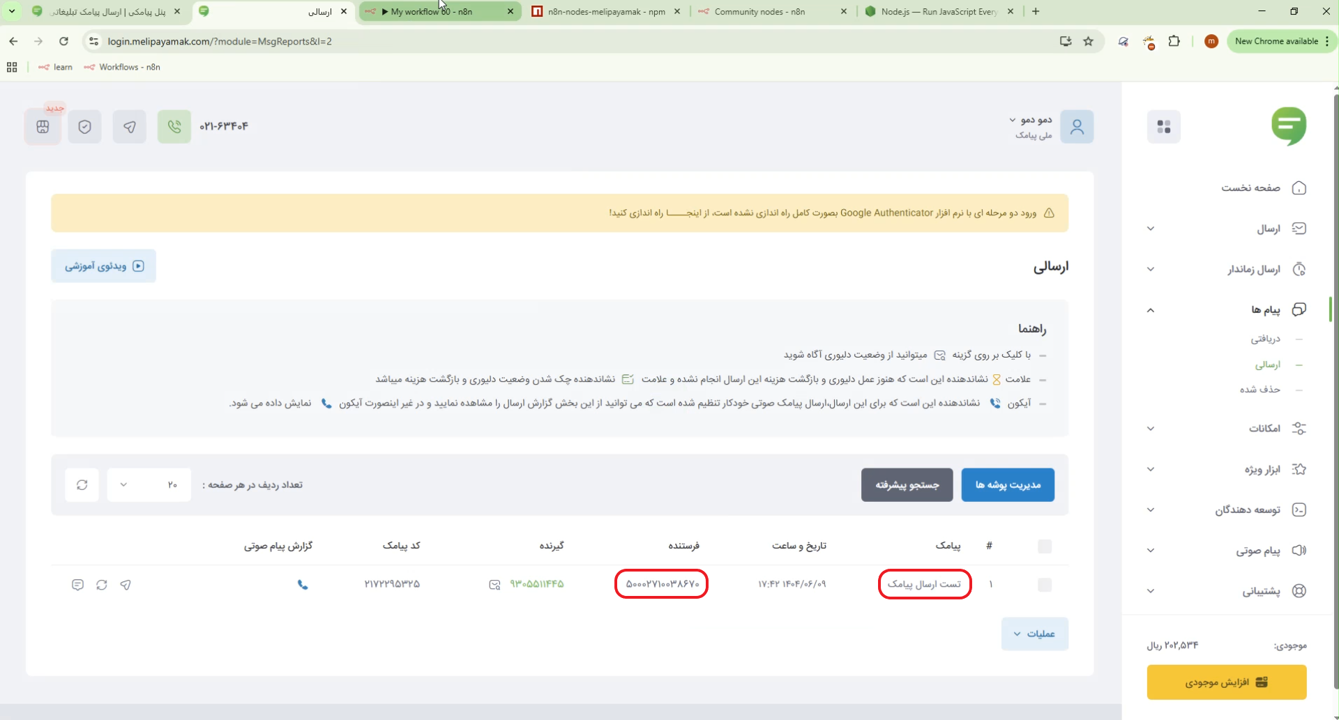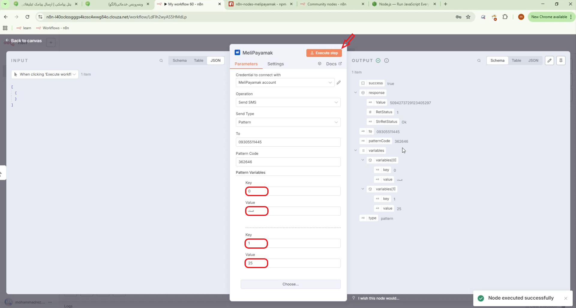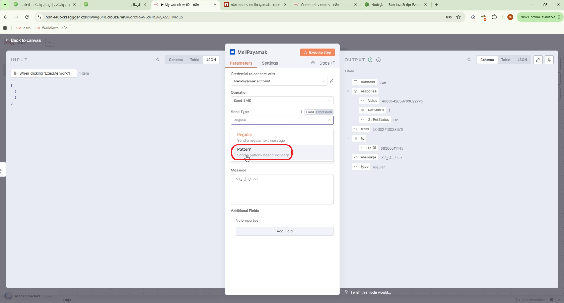 ۴. ارسال پیامک با MeliPayamak و بررسی خروجی در n8n