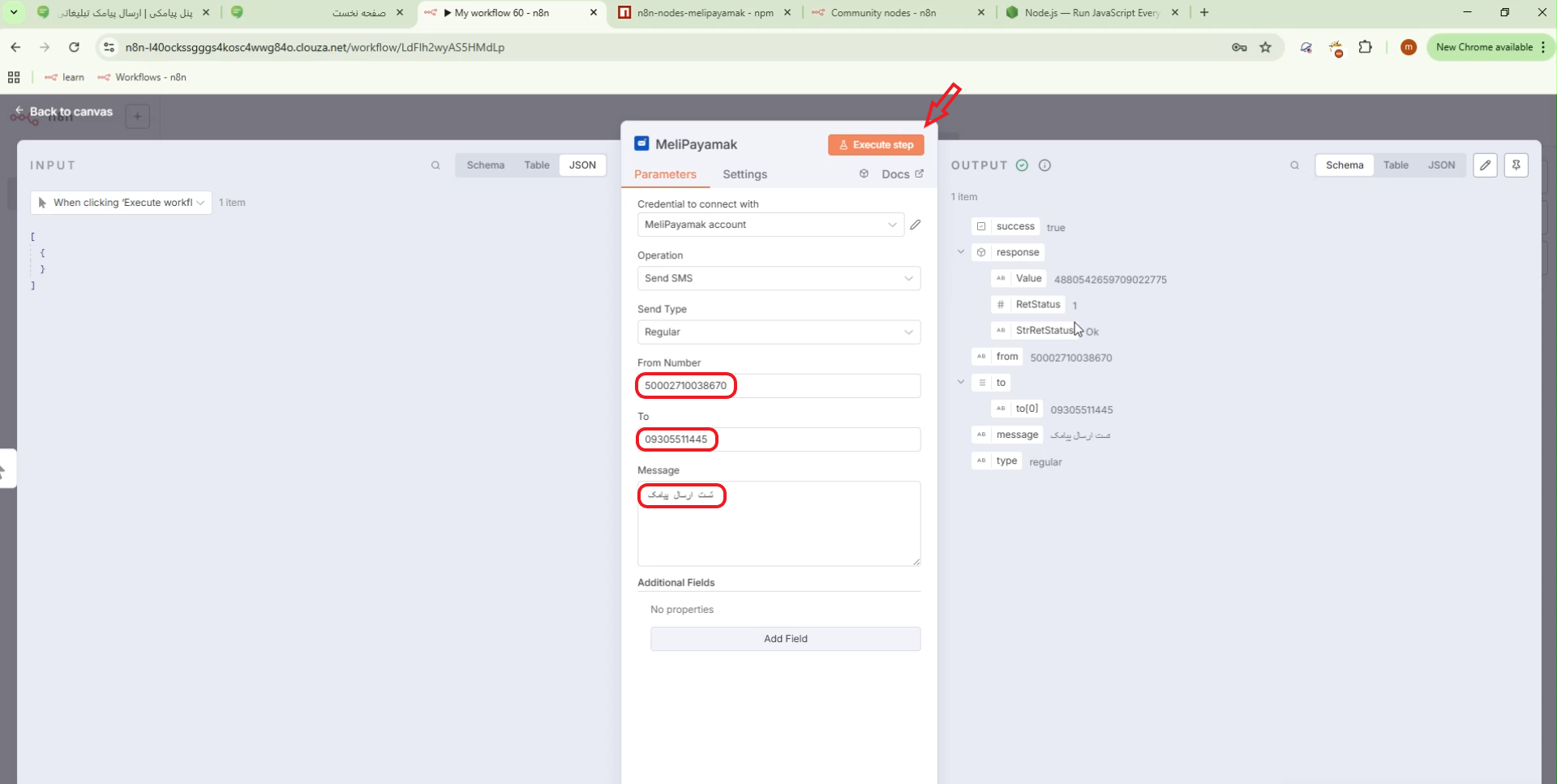- در نهایت روی Execute Step کلیک میکنیم تا پیامک ارسال شود.