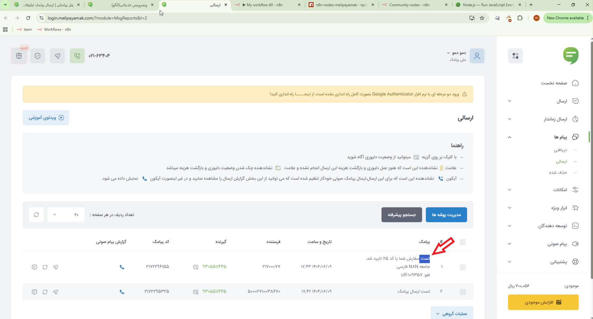 وارد پنل ملی پیامک میشویم و در قسمت پیام های ارسالی میبینیم که این تست با موفقیت انجام شد.