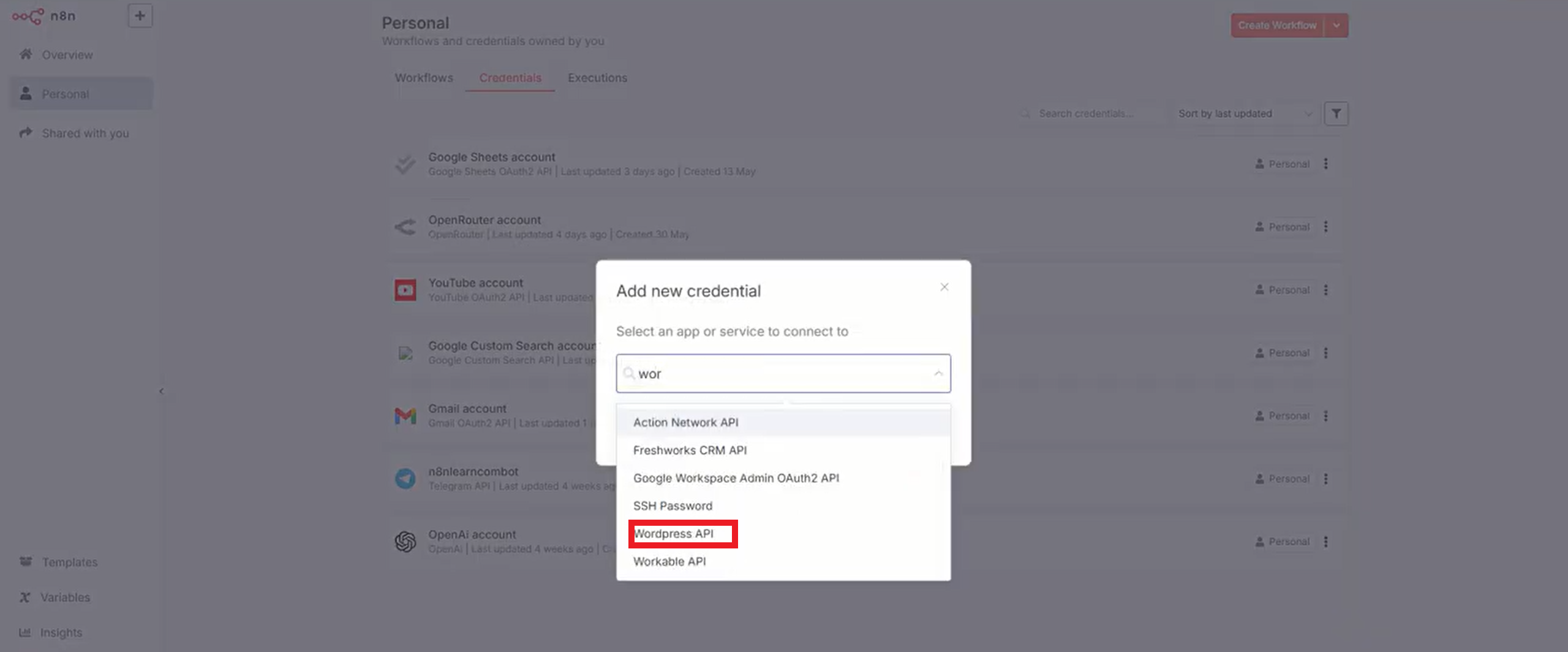 ابتدا وارد پروفایل خود در پنل n8n شوید. سپس در بخش جست‌وجو، افزونه یا نود مربوط به وردپرس را پیدا کنید. برای این کار کافی است کلمه‌ی “WordPress” را وارد کرده و جست‌وجو کنید. با این روش به‌راحتی می‌توانید نود وردپرس را بیابید و برای اتصال سایت خود آماده شوید.