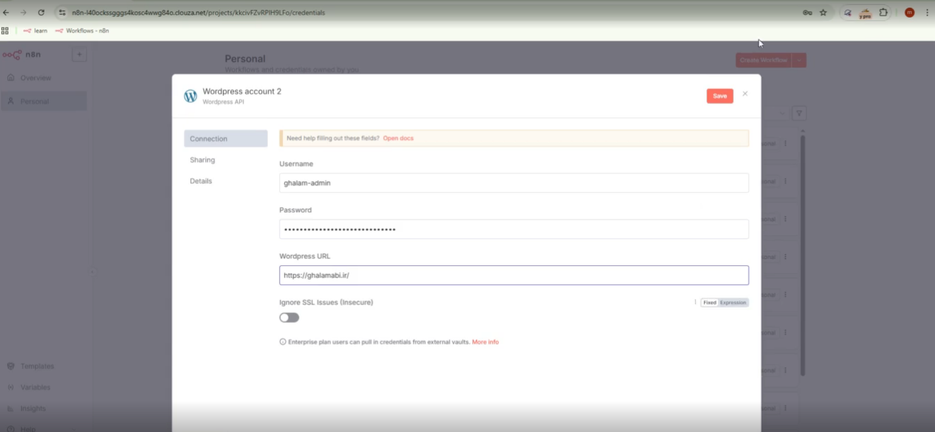 مرحله ۳- تنظیمات در n8n برای اتصال به وردپرس