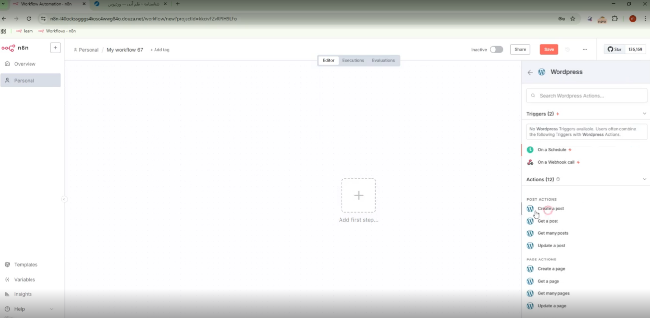 1. یک ورک‌فلو جدید در n8n بسازید و از نود WordPress استفاده کنید؛ به‌عنوان‌مثال، گزینه create a post را انتخاب کنید؛